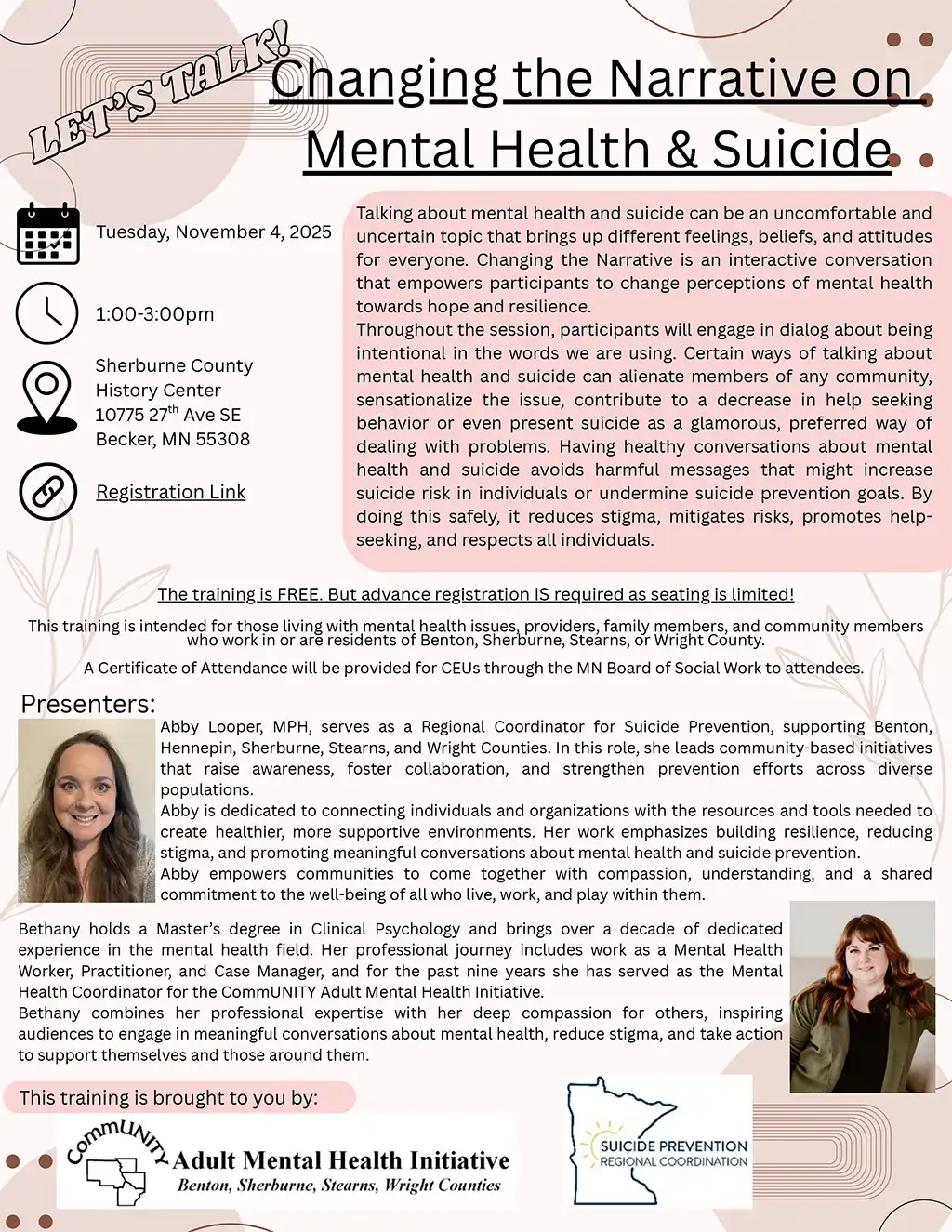 Throughout the session, participants will engage in dialog about being intentional in the words we are using. Certain ways of talking about mental health and suicide can alienate members of any community, sensationalize the issue, contribute to a decrease in help seeking behavior or even present suicide as a glamorous, preferred way of dealing with […]  |